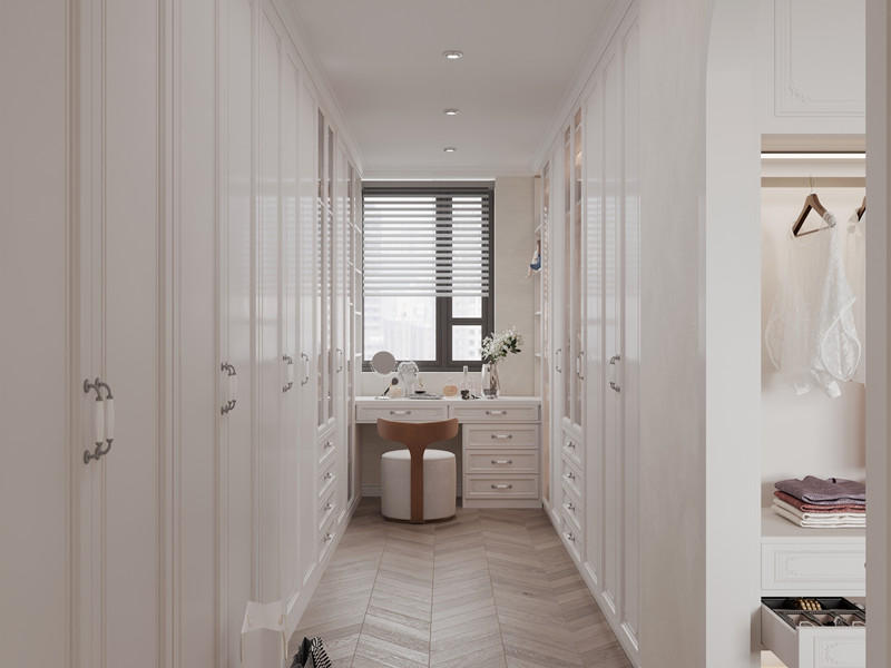在卧室单独规划一个空间做步入式布局的卧室衣柜,即:衣帽间。单独的收纳空间,衣物分类清晰,取物方便;可作为“穿搭区”,提升生活仪式感。