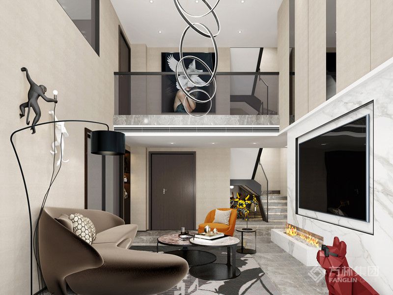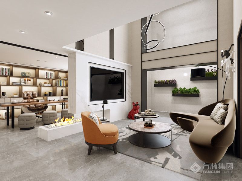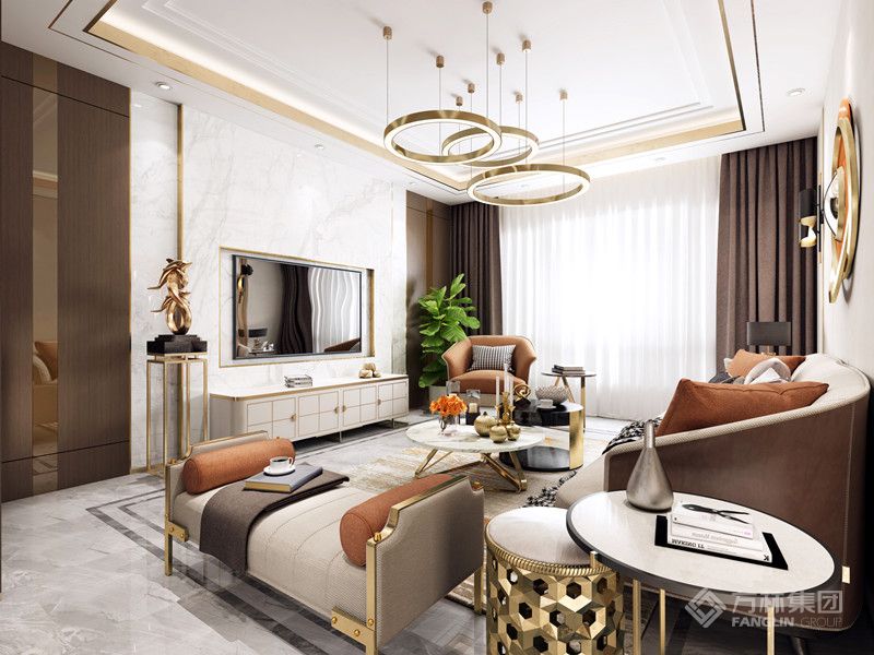 本案设计采用简练的线条、鲜明的彩色、简约实用具有高级感的家具,内嵌式线条的造型设计给人以平衡感,置身其中让人感觉房内的空间感觉宽阔,营造出了一种轻奢的氛围。