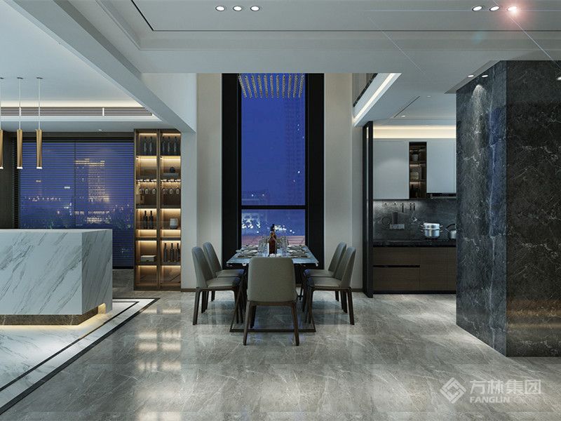 整个空间理石与木质的搭配,主色调与整体环境统一又兼具个性。敞开式的空间兼具客厅、餐厅、水吧,强化了室内空间的统一感与精致感,以满足家庭日常、亲友聚会等多元化的场景的需求,一目了然的布局加强了扩宽空间的极致概念,舒适的空间被最大化利用。客厅以青绿色壁挂装饰进行点缀,让色彩在空间中呈现出不一样的个性表达。沙发与茶几模块化组合,提供自由组合,满足空间和品味的个性化需求。